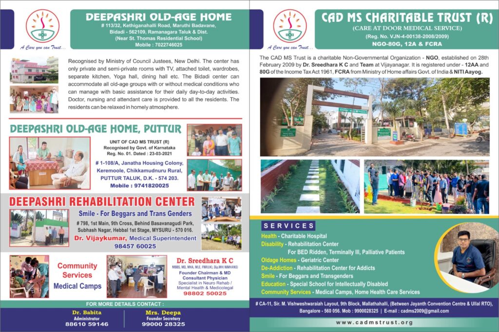 With the blessings of Dr. Sri Veerendra Hegde (Sri Dharmasthala Dharmadarshi), CAD MS TRUST has extended activity to Puttur Dakshina Kannada District and established Deepashri Old Age Home in Shiva Shakthi Nagar, Behind Kottecha Hall, APMC Road, Puttur, Dakshina Kannada District.